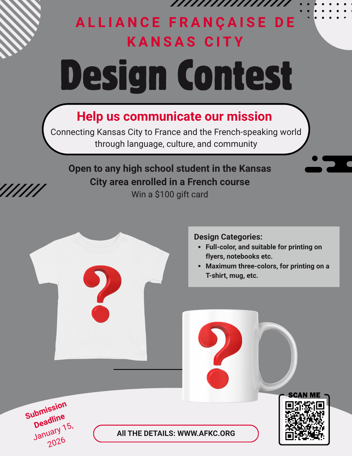 The Alliance Française de Kansas City invites your students to enter our first graphic design contest! AFKC is looking for creative designs (see details below) to represent our organization on merch and flyers. The criteria: The winning designs will be determined by how well they represent our mission statement: