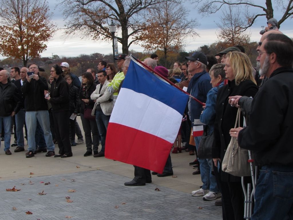 included a moment of silence in honor of the victims. Many held French flags, candles, and flowers, while voices joined together to sing La